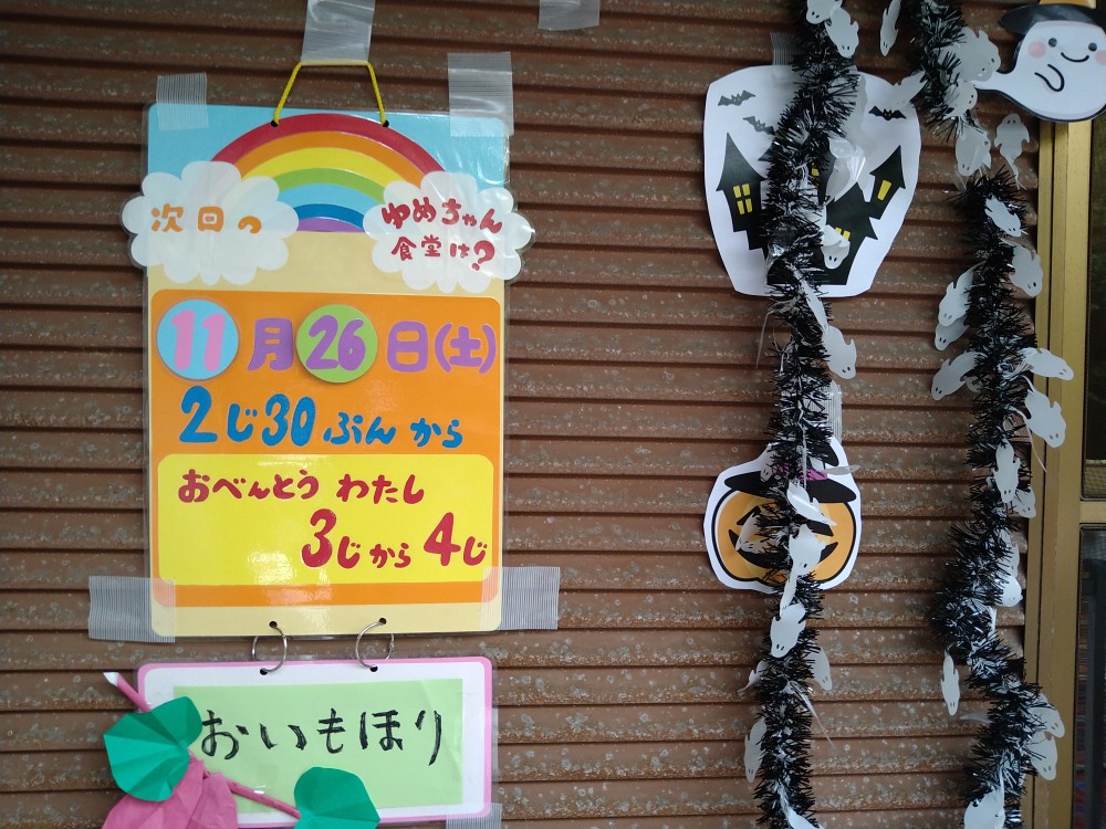 10月22日(土)今月はハロウィンということで、仮装して参加された子供達、子供達とジャンケンをしてお菓子を配っていたボランティアの方々、飾りつけなど、いつも以上に華やかな雰囲の中、参加された皆さんは、ハロウィンの気分を味わえたのではないでしょうか。また、ジャンケンゲーム、たくさんのお菓子の配布、紙芝居などとても楽しそうに過ごされていました。今回は、明治公民館で子供の居場所を立ち上げている方々の参加もありました。また、ボランティアの方々からの差し入れの品々や手作りのおべんとうの配布もありました。次回は11月26日(土)です。サツマイモ掘りが予定されています。「ゆめちゃんの会」は村岡子育て応援隊の運営です。
