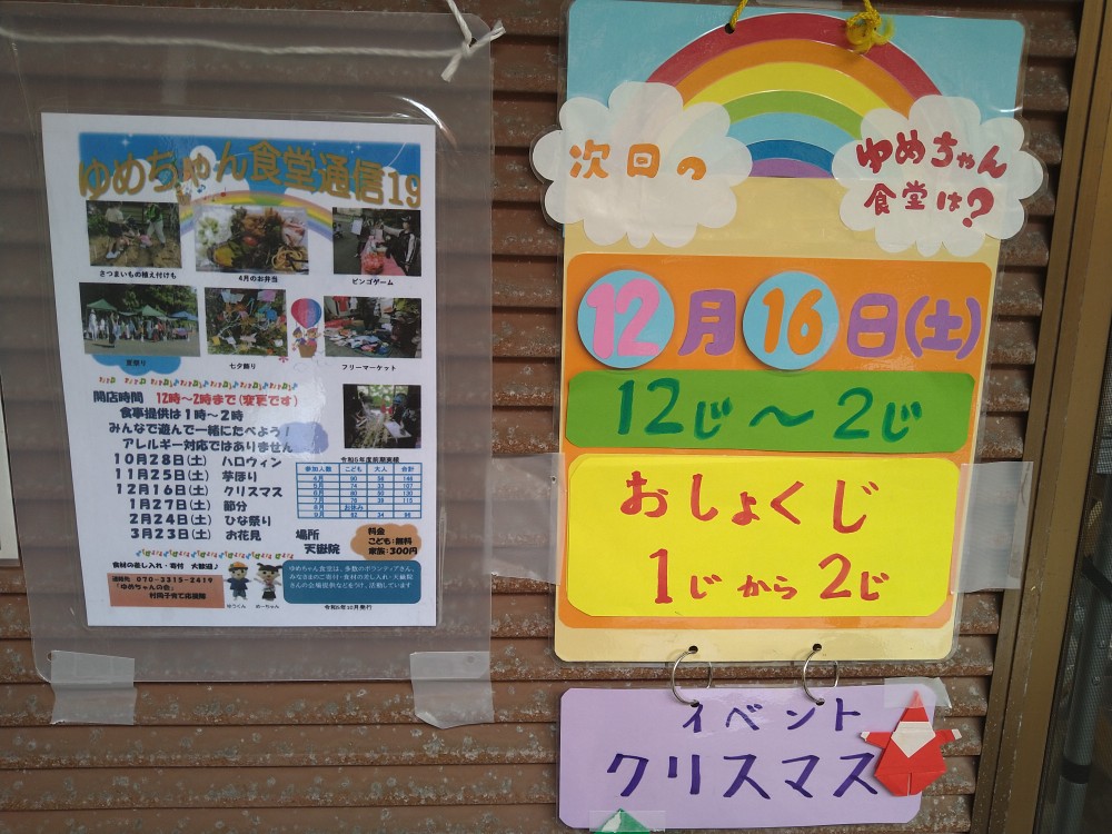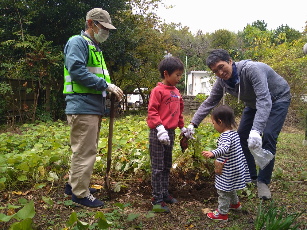 11月25日、曇り空の肌寒い中、たくさんの親子連れの方々の参加がありました。今回は春に子供たちが苗付けをしたさつま芋の収穫です。ボランティアの方にお手伝いをいただきながら、大きなお芋や小さなお芋、大きさはいろいろでしたが自分で収穫するという体験を楽しんでいました。今回もボランティアの方々からの差し入れの品々、手作り弁当の配布がありました。また、とても具沢山の豚汁のおふるまいがありました。お代わりをされる親子さんもいらっしゃいました。来月はクリスマス会です。「ゆめちゃんの会」は村岡子育て応援隊の運営です。お問い合わせは「ゆめちゃんの会」070-3315-2419です。