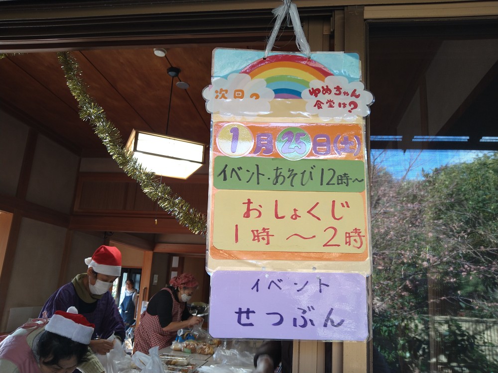 12月21日(土)クリスマス会ということで、ボランティアの方々がサンタの格好をされていたり、飾りつけがあったりいつも以上に華やかな会になりました。好天にも恵まれたくさんの親子連れの方々の参加がありました。今回は藤沢ライフライオンズクラブの方々の参加があり、輪投げゲーム、お菓子の配布などをされていました。今回もボランティアの方々からの差し入れの品々、手作り弁当の配布、豚汁のおふるまいがありました。今回が今年最後の開催となりましたが、ボランティアの方々、差し入れを下さる方々、ゆめちゃん食堂に関わって下さるすべての方々に感謝です。来年もたくさんの子供たち、親御さんたちの参加をお待ちしております。次回は令和7年1月25日(土)節分の会です。「ゆめちゃんの会」は村岡子育て応援隊の運営です。お問い合わせは「ゆめちゃんの会」070-3315-2419