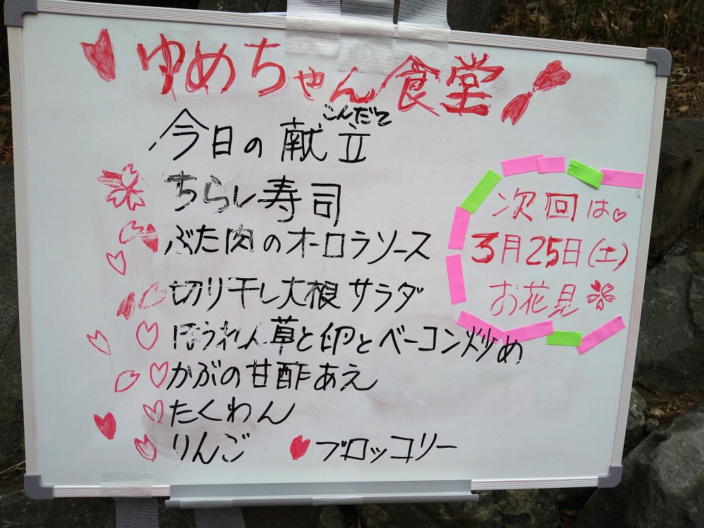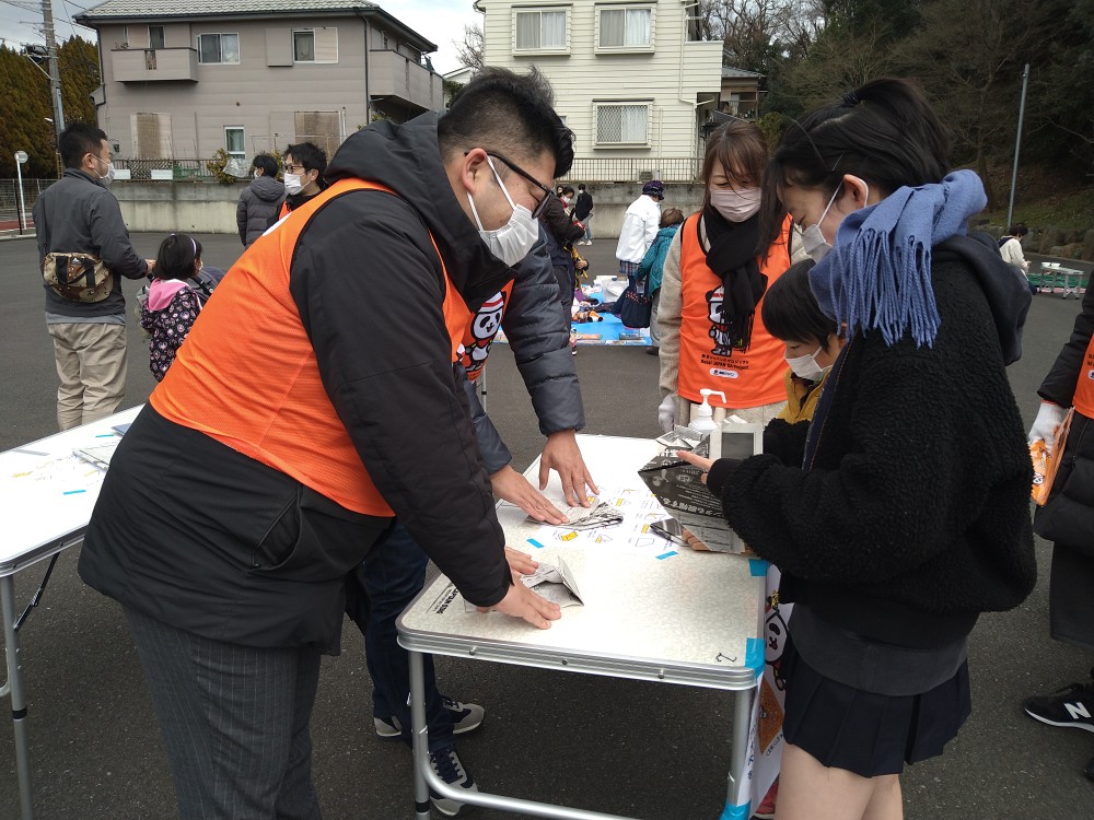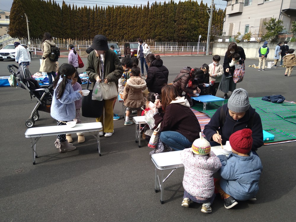 2月25日、たくさんの親子連れの方々の参加がありました。今回は天嶽院広域避難場所にて手作り弁当、ボランティアの方々からの差し入れの品々などの配布がありました。また、お汁粉を食べて頂いたり、防災時に使える食器を新聞紙で作成したり、フリーマーケットも開催されました。曇り空の中、子供たちは竹ぽっくりで遊んだりと寒さに負けず元気に参加していました。次回は3月25日(土)お花見の会です。「ゆめちゃんの会」は村岡子育て応援隊の運営です。お問い合わせは「ゆめちゃんの会」070-3315-2419へお願い致します。