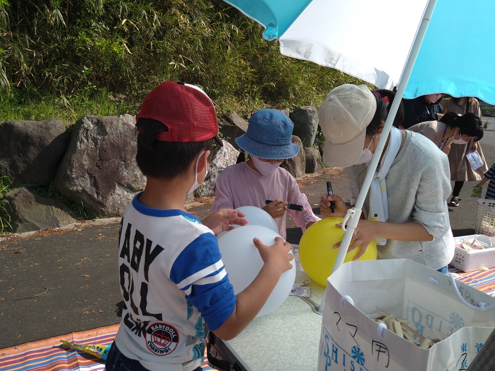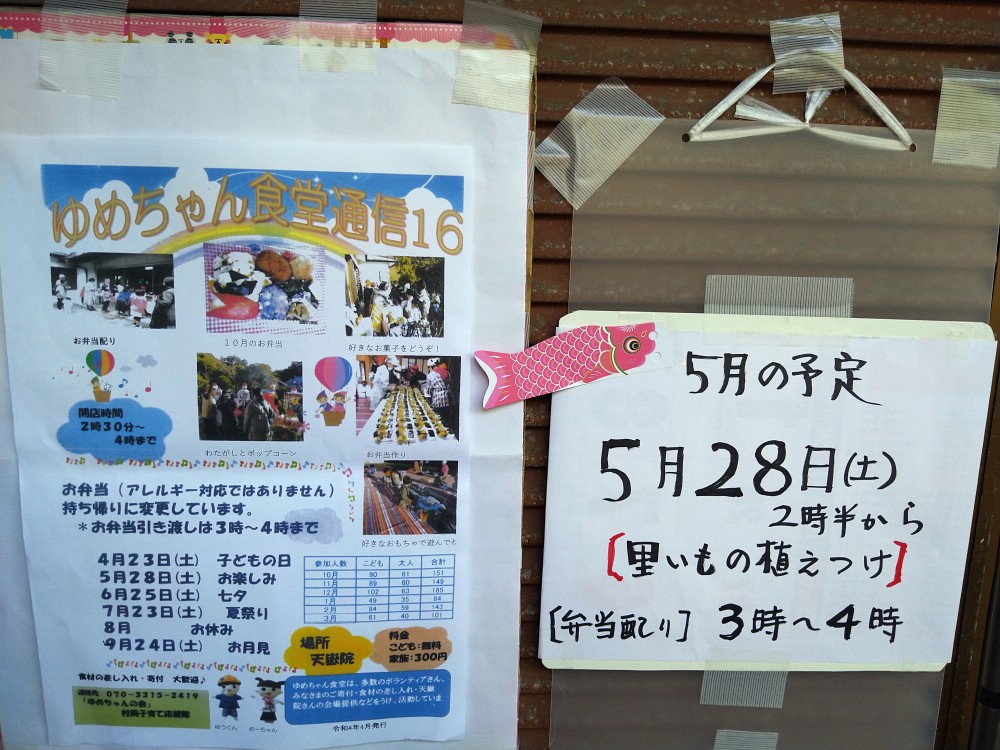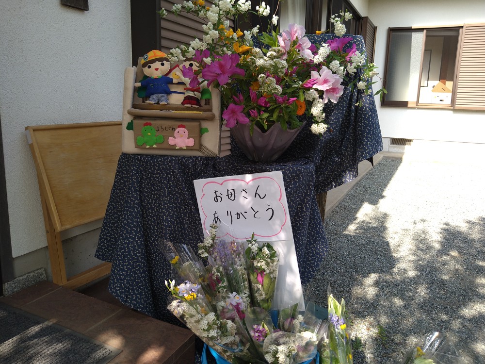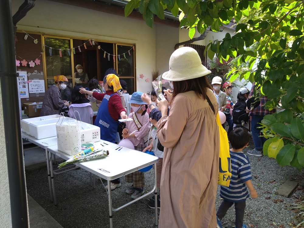 晴天に恵まれ気温も上がり少し暑さを感じる中、開催されました。母の日が間近ということで、子供達からお母様方へプレゼントができるように花束が用意され、プレゼントされたお母様方は大変喜んでいらっしゃいました。ボランティアの方々からの差し入れの品々や手作り弁当などが配布され、大勢の親子連れの方々でにぎわいました。また、天嶽院広域避難場所では子供達が風船に絵を描いたり、ボランティアの方の手作りの竹とんぼ、竹ぽっくりで遊んでいました。次回は5月28日(土)です。「ゆめちゃんの会」は村岡子育て応援隊の運営です。