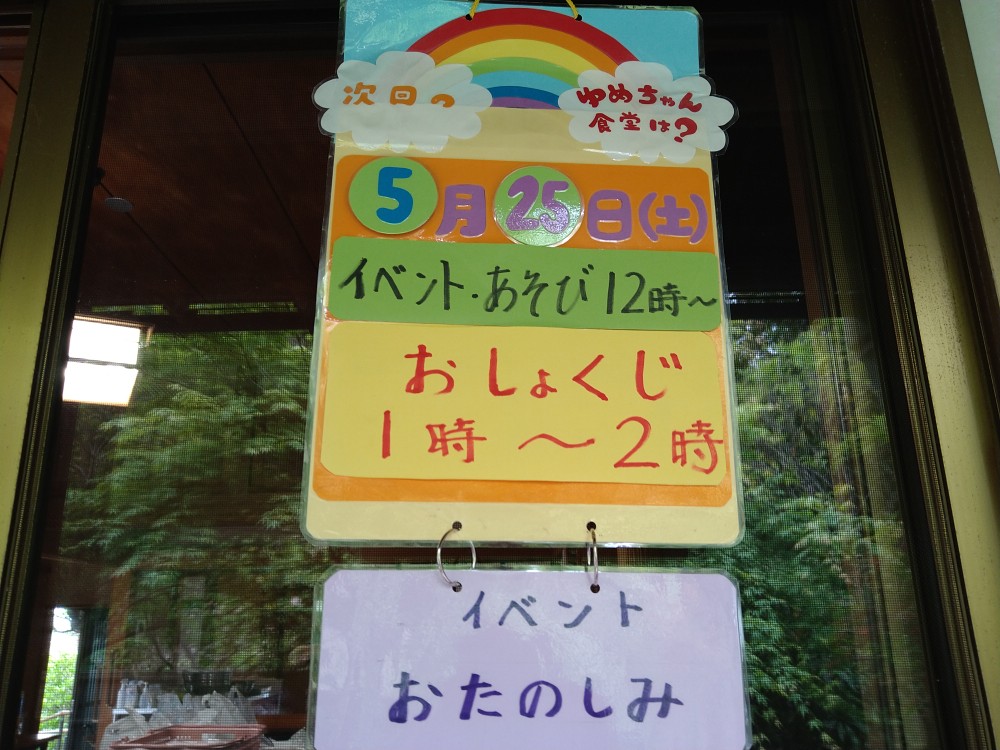 4月27日(土)朝方の雨がやみ曇り空の中、たくさんの親子連れの方々の参加がありました。今回はビンゴゲームの開催があり数字の発表があるたびに、子供たちから歓声があがっていました。たくさんの景品の用意がされていました。また、花束の用意もありました。今回もボランティアの方々からの差し入れの品々と手作りのお弁当の配布がありました。来月は5月25日(土)です。「ゆめちゃんの会」は村岡子育て応援隊の運営です。お問い合わせは「ゆめちゃんの会」070-3315-2419です。