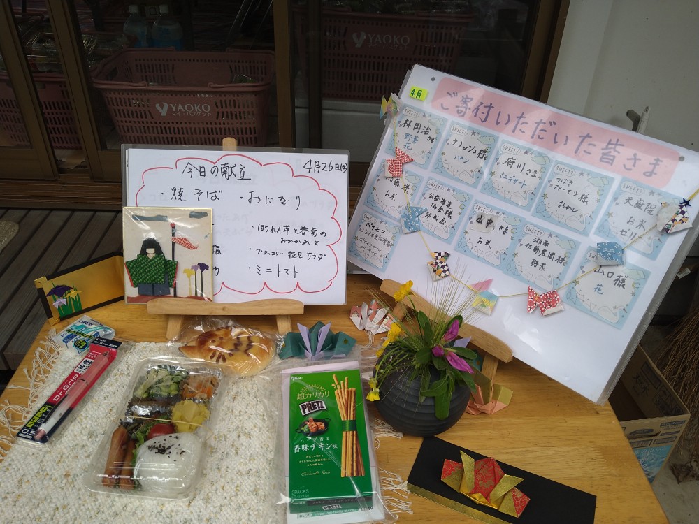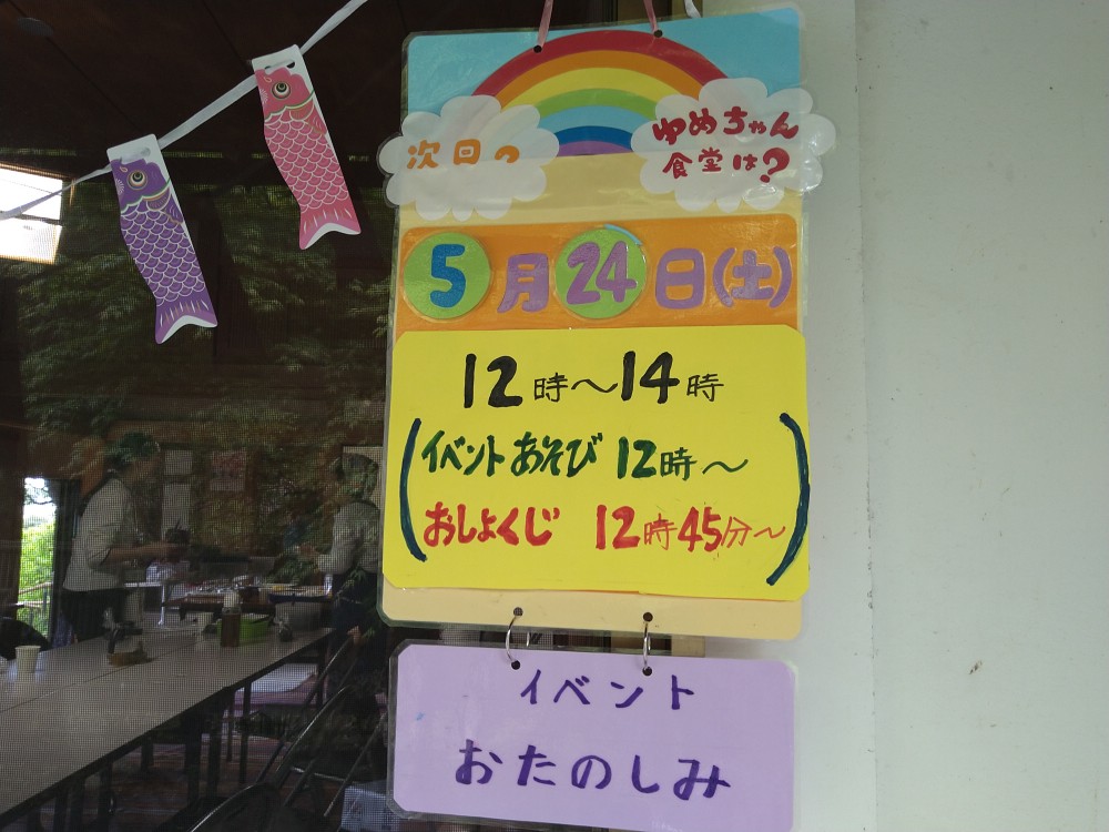 4月26日(土)曇天の中、たくさんの親子連れの方々の参加がありました。今回はこどもの日の会ということで、鯉のぼりや兜の飾りがありました。今回もボランティアの方々からの差し入れの品々、手作り弁当の配布、豚汁のお振る舞いがありました。また、天嶽院の盆踊りでおなじみの一久さんが広域避難場所で焼きそばを作って下さいました。参加された皆さんは、お弁当に豚汁に焼きそばと盛りだくさんのお振る舞いを楽しまれていました。次回は5月24日(土)です。「ゆめちゃんの会」は村岡子育て応援隊の運営です。お問い合わせは「ゆめちゃんの会」070-3315-2419です。