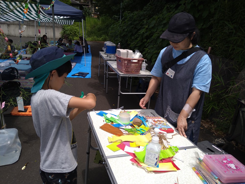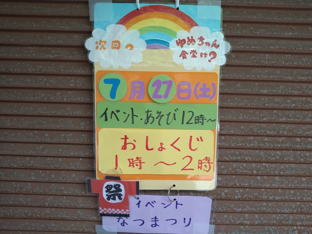 6月22日(土)夏のような日差しが照り付ける中、たくさんの親子連れの方々の参加がありました。今回は七夕の会ということで、子供たちが各々短冊に願いを書いて笹飾りにつけていました。又、広域避難場所ではシャボン玉、水鉄砲、竹ぽっくりなどで元気に遊んでいました。今回もボランティアの方々からの差し入れの品々、手作り弁当の配布がありました。次回は7月27日(土)です。「ゆめちゃんの会」は村岡子育て応援隊の運営です。お問い合わせは「ゆめちゃんの会」070-3315-2419です。