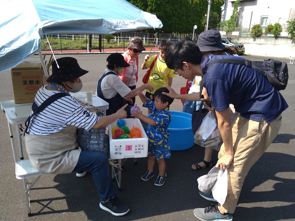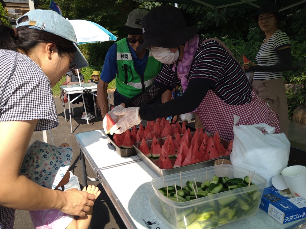7月22日、夏の日差しが厳しい中、たくさんの親子連れの方々の参加がありました。夏祭りの会ということで、当てくじ、水鉄砲、魚の絵の描いた木札釣り、ヨーヨー釣りなどが催されました。暑い中の開催ということで、スイカ、きゅうり、梅ジュースのおふるまいがありました。今回は天嶽院広域避難場所にて手作り弁当、差し入れの品々の配布がありました。梅ジュースをごちそうになりましたが、梅ならではの酸っぱさがとてもおいしく暑くなっだ身体にしみわたりました。とても暑い中、たくさんのボランティアの方々が活動されてました。次回は9月23日です。8月はお休みです。「ゆめちゃんの会」は村岡子育て応援隊の運営です。お問い合わせは「ゆめちゃんの会」070-3315-2419です。