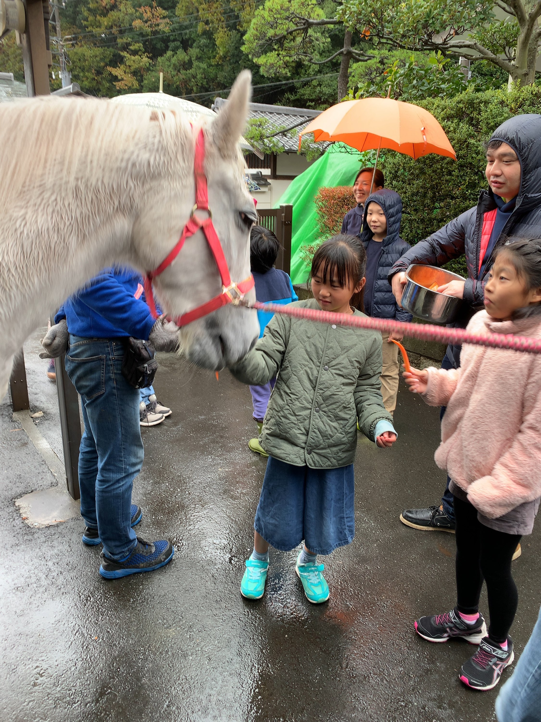 11月23日あいにくのお天気でしたが、二頭の可愛いお馬さんがやってきて人参をあげたり