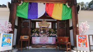 誕生仏に甘茶をそそいでお祝いして頂き、飲んで頂けるようにご用意してありますので、いらっしゃいませんか。(9時~17時まで)