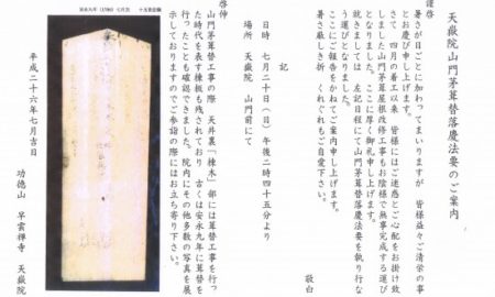 天嶽院山門茅葺替工事は5ヶ月ぶりに完了しました。 記録に残る葺替は安永九年(1……